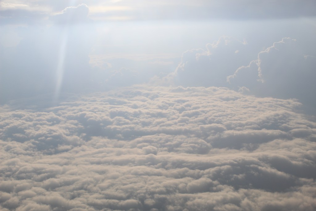 und dann heben wir ab. es gibt diese yoga position, sie wird die ‚volle heuschrecke‘ genannt. jeden morgen führe ich sie aus, und jeden morgen fühlt es sich ein bisschen an wie fliegen. nur jetzt geht es ganz leicht – für mich. ich muss nichts tun. nur spüren: dieses kribbeln im bauch. es ist unbeschreiblich – immernoch. wie zur hölle haben wir das geschafft? von oben auf die wolken zu schauen… da stimmt doch irgendetwas nicht. und doch sind sie da, vor mir, breiten sich aus wie ein teppich, oder türmen sich wie zuckerwatte. ich werde das gefühl nicht los, dass ich etwas sehe, was ich nicht sehen sollte – und bin begeistert. schieße unaufhörlich fotos, es macht klack – klack – klack. ich hoffe, die anderen passagiere sind nicht genervt.